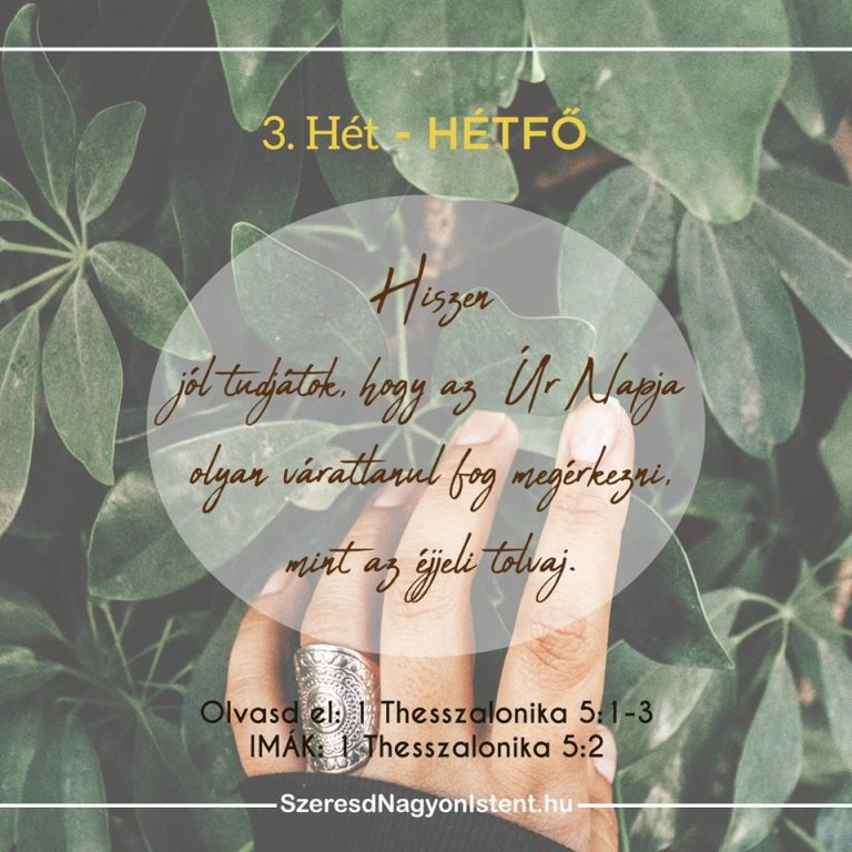 Atyám, köszönöm a Menny ígéretét. Segíts, hogy várjam a visszajöveteled, és bízzak abban, hogy Te teljes mértékben ura vagy életem minden egyes napjának.