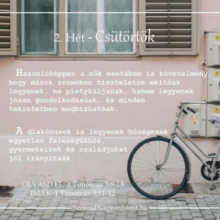 köszönjük, hogy olyan csodálatos felelősséget adtál nekünk, hogy a Te szeretetedet mutassuk meg a körülöttünk lévőknek. Segíts a Te dicsőségedre élni, az örökkévalóságot szem előtt tartva. Kérlek, áldd meg a kezünk munkáját és adj nekünk erőt és bölcsességet, amire szükségünk van, hogy feltöltekezzünk a Te szándékaiddal, akaratoddal az életünkre vonatkozóan. Segíts, hogy bátrak, másokat szeretők, és erősek legyünk, hogy mindennap érted éljünk. Ámen.” (YouVersion)