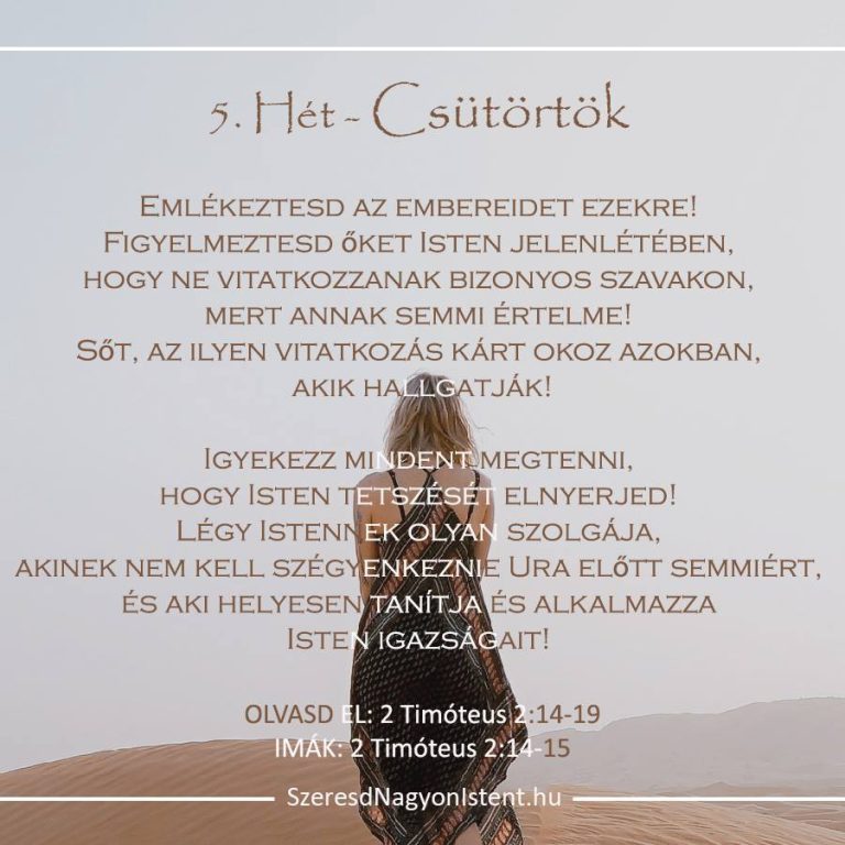 Veszekedéssel nem lehet embereket megnyerni magadnak. Ehelyett imádkozz és kérd Istent, hogy munkálkodjon azoknak az egyéneknek a szívében. A munkánk az, hogy pontosan ismerjük és tanítsuk Isten szavát. Hogy ismerjük Isten szavát, Isten szavában kell lennünk. Ha küszködsz azzal, hogy időt találj Isten Igéjében lenni vagy hiányzik a vágy hozzá, menj Istenhez segítségért. Kérd Őt, hogy vágyat teremtsen a szívedben az Ő Igéjének olvasására és szenvedélyt arra, hogy jobban megismerd Őt. Ha néha küzdesz annak a megértésével, amit olvasol, az is rendben van! Emlékezz arra, hogy Isten mindig veled van és buzgón segít. Kérd Tőle, hogy segítsen megérteni, amit olvasol; hogy megtaláld a kincset, amit alkalmazhatsz az életedre.
