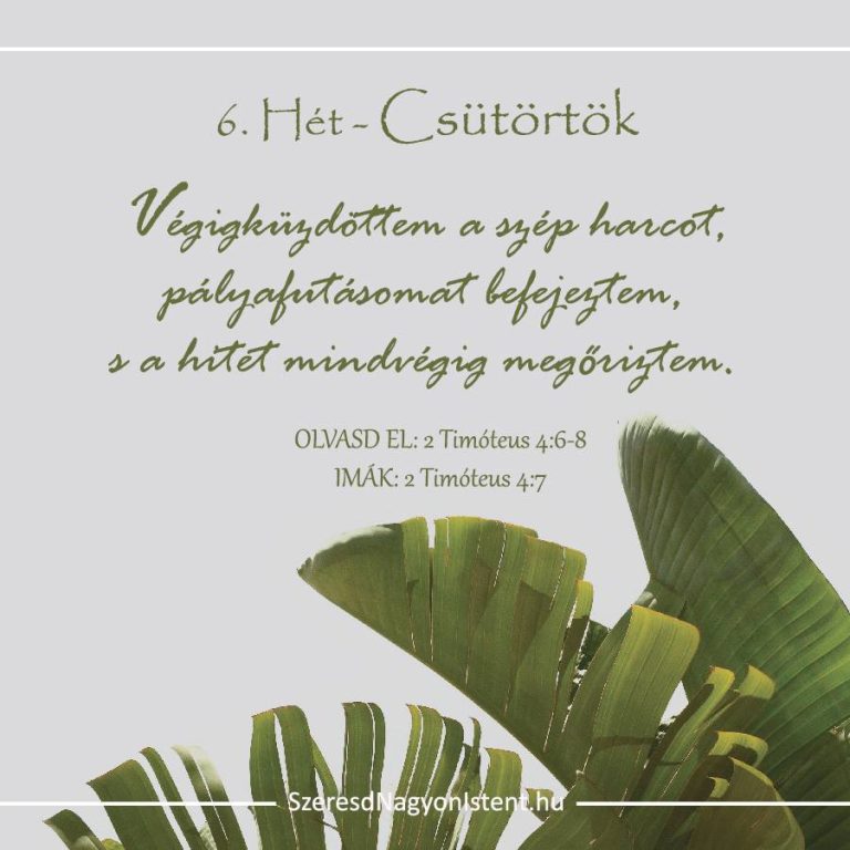 Segíts mindig arra emlékezni, hogy ez a világ nem az otthonom. Segíts Rád támaszkodni, amikor csatákban találom magam…Segíts megharcolni a jó harcot és emlékezni, hogy soha nem vagyok egyedül bennük. Segíts megfutni a harcot, amit belém helyeztél. Segíts rád koncentrálni és ne a körülöttem lévő világra. Helyezd azokat az életembe, hogy bátorítsanak és hogy a Te kezed és lábad legyek, amikor megsebesítenek és elbátortalanodok. És segíts, hogy ez legyek másoknak is. Ámen. (YouVersion)