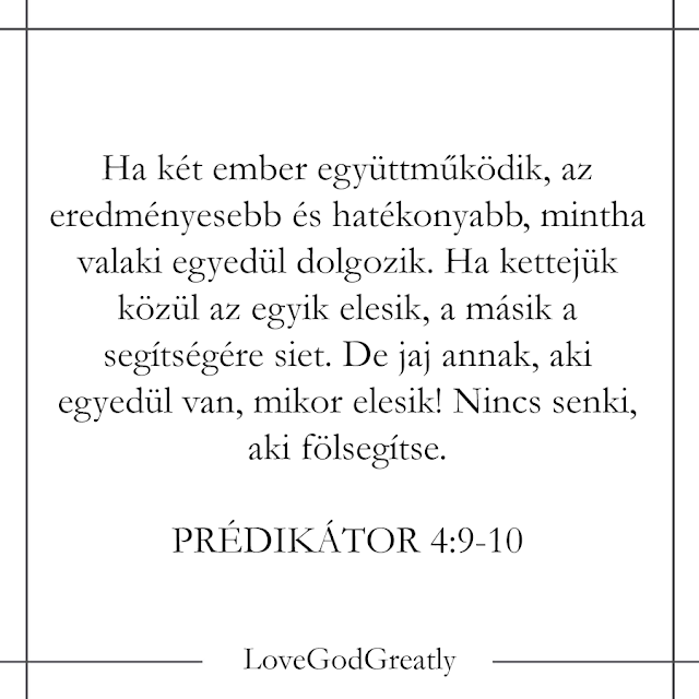 “Mi haszna van a munkásnak abból, amiért fáradozik? Láttam mindazt az elfoglaltságot, amit Isten adott az emberek fiainak, hogy fáradozzanak.Mindent szépen alkotott Isten a maga idejében. Az örökkévalóságot is az emberek szívébe helyezte, de úgy, hogy elejétől a végéig nem foghatják föl mindazt, amit Isten cselekszik. Fölismertem, hogy nem tehet jobbat az ember, mint hogy örvendjen, és jót tegyen egész élete során. De még az is Isten ajándéka, hogy az ember eszik és iszik, és jól él fáradságos munkájából. Tudom, hogy amit Isten cselekszik, az örökké megáll, ahhoz nincs mit hozzáadni, és abból nincs mit elvenni. Isten azért cselekszi ezt így, hogy féljék őt. Ami most történik, már régtől megvan, és ami következik, az is már régen megvolt; és Isten visszahozza, ami elmúlt.”