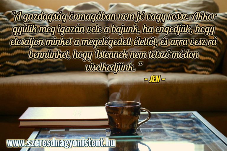 A gazdagság önmagában nem jó vagy rossz. Akkor gyűlik meg igazán vele a bajunk, ha engedjük, hogy elcsaljon minket a megelégedett élettől, és arra vesz rá bennünket, hogy Istennek nem tetsző módon viselkedjünk. Az igenis rossz, amikor annyira elkezdünk vágyni a gazdagságra és a földi javakra, hogy félretesszük a tisztességet és az őszinteséget azért, hogy megszerezzük azt, amit akarunk.