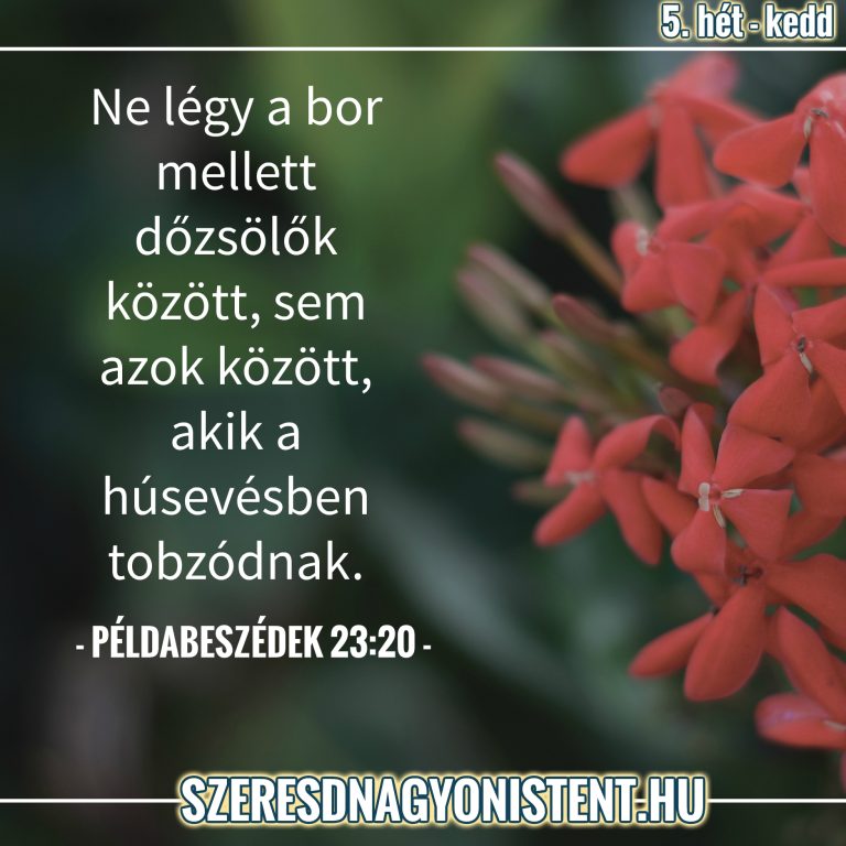 “Hallgass rám, fiam, légy bölcs, és őrizd meg szívedet ezen az úton. Ne légy a bor mellett dőzsölők között, sem azok között, akik a húsevésben tobzódnak. Mert a részeges és tobzódó elszegényedik, és rongyokba öltöztet a sok alvás.” (Példabeszédek 23:19-21)