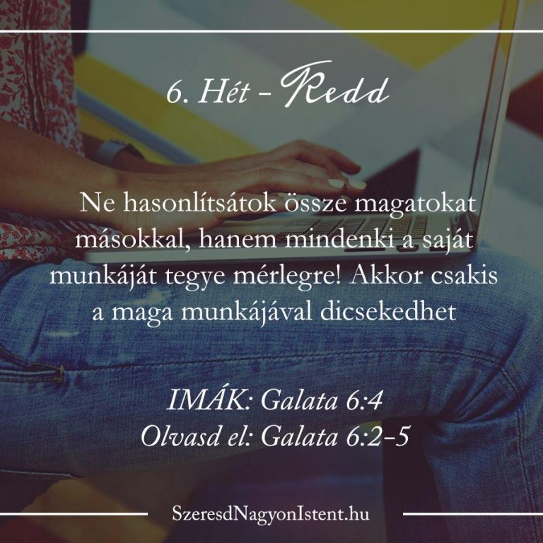 “Pál arra bíztatja a galatákat, hogy hordozzák egymás terhét, és csak azon dolgok felől örvendjenek, amiket az Úr tett értük. Sokan hajlamosak vagyunk arra, hogy saját hibáinkkal szemben toleránsak legyünk és igazoljuk tévedéseinket, miközben a mások hibáit kritizáljuk és elítéljük. Ha ez gyakorta megtörténik, megkeményedik a szívünk és megfeledkezünk arról, hogy milyen nagy szükségünk van Istenre. Hívőkként szükséges, hogy könyörületesek legyünk egymás iránt, miközben naponta megvizsgáljuk saját szívünket ahhoz, hogy alázatosak maradjunk és tudatában legyünk annak, hogy óriási szükségünk van a Megváltóra.