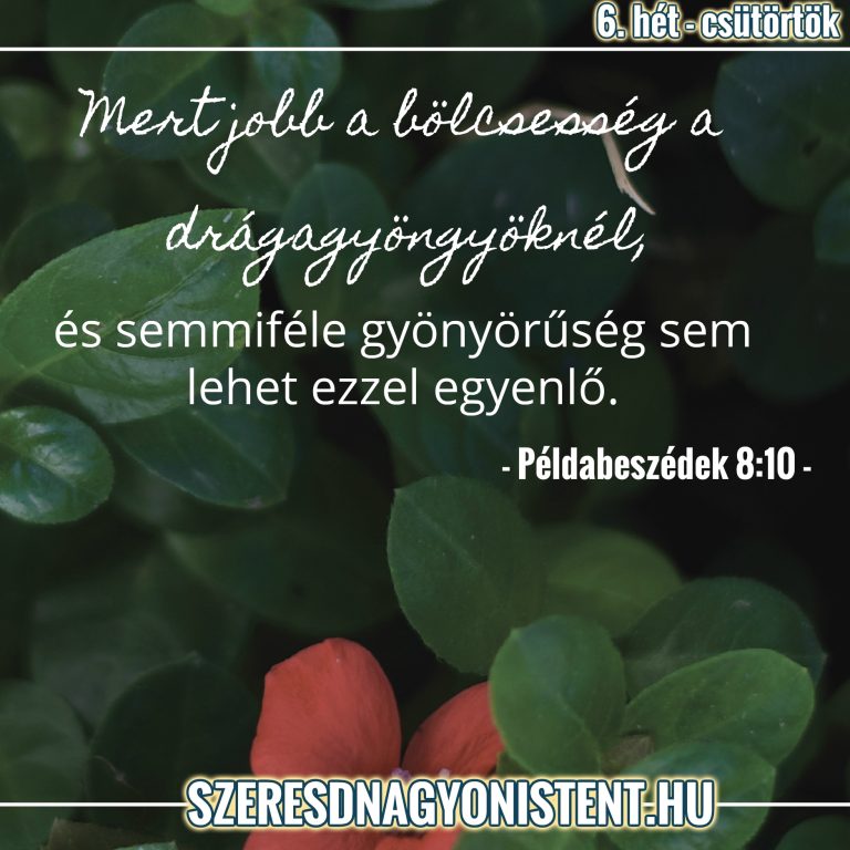 Olvasd el: “Inkább az én tanításomat válasszátok, ne pedig az ezüstöt! A tudományt válasszátok inkább, mint a színaranyat! Mert jobb a bölcsesség a drágagyöngyöknél, és semmiféle gyönyörűség sem lehet ezzel egyenlő. Én, a bölcsesség együtt lakom az eszességgel, és megszereztem a megfontolás tudományát. Az ÚR félelme a gonosz gyűlölése. A kevélységet és fölfuvalkodottságot, a gonoszság útját és az álnok szájat gyűlölöm. Enyém a tanács és az igazi bölcsesség, én vagyok az értelem, enyém az erő. Általam uralkodnak a királyok, és tesznek igazságot az uralkodók. Általam uralkodnak a fejedelmek és a nemesek meg a föld összes bírája. Szeretem az engem szeretőket, és akik szorgalmasan keresnek engem, azok megtalálnak. Gazdagság és tisztesség van nálam, tartós vagyon és igazság. Gyümölcsöm jobb, mint az arany, drágább a színaranynál, és a jövedelmem többet ér a színezüstnél. Az igazság útján járok, az igazság ösvényének közepén,hogy az engem szeretőknek értékes örökséget adjak, és erszényeiket megtöltsem.” Példabeszédek 8:10-21