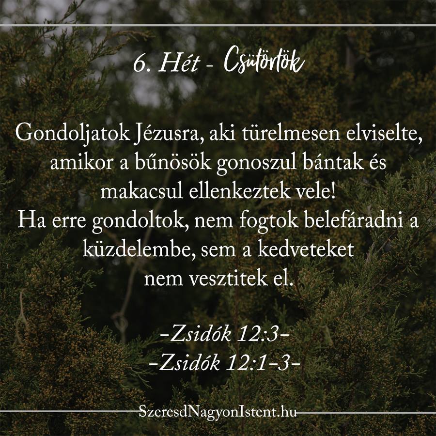Mennyei Atyám, köszönöm Neked, hogy Te megerősítesz, hogy szembe tudjak nézni és ki tudjak tartani, amikor fájdalmat érzek, vagy összetörik a szívem, miközben Téged szolgállak. Frissíts fel és újíts meg engem, mikor kimerültté válok. Munkálj ki bennem állhatatosságot és kitartást, ami szükséges ahhoz, hogy megfussam azt a versenyt, amit Te elkészítettél nekem. Jézus Nevében, Ámen.” (YouVersion)