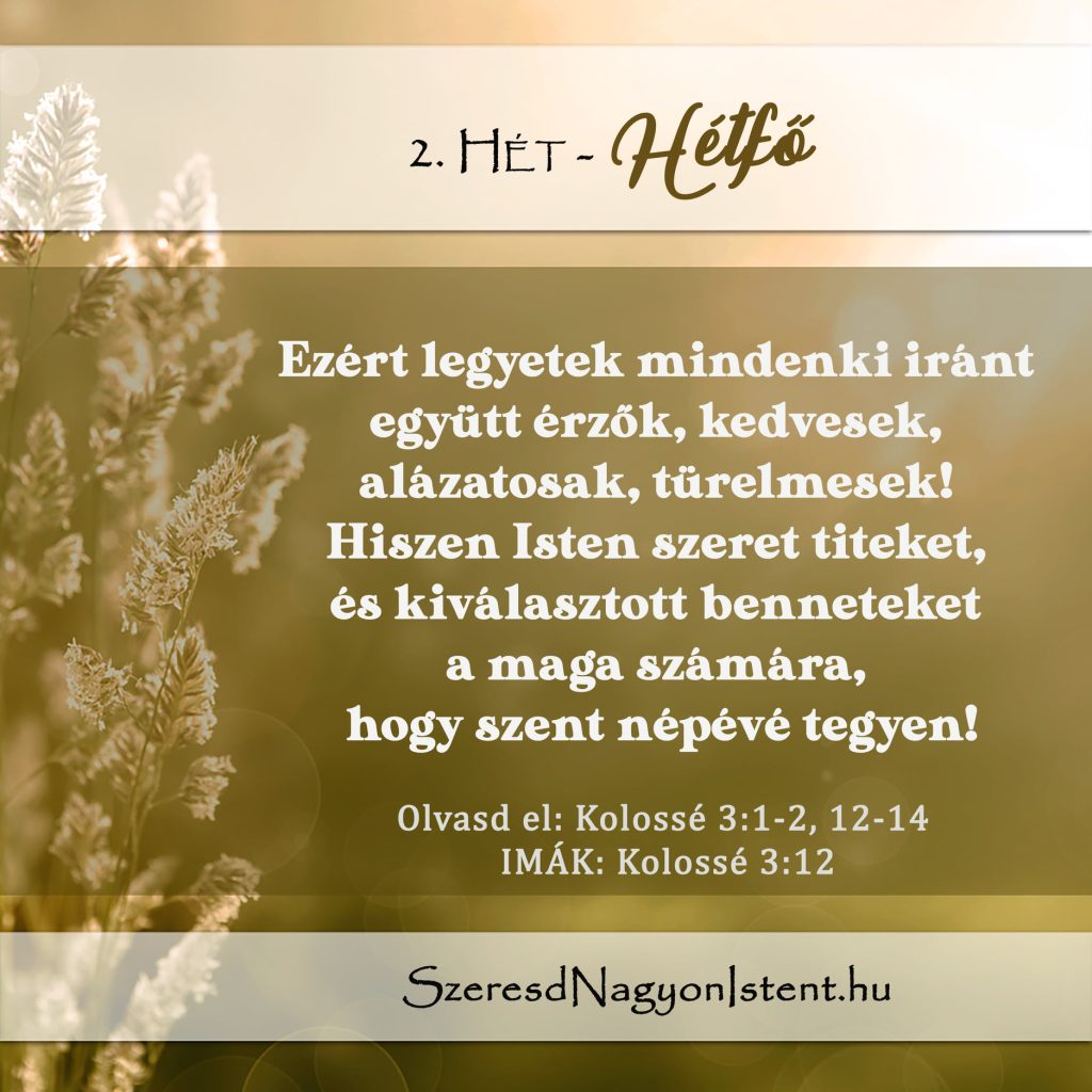 „Ezért legyetek mindenki iránt együtt érzők, kedvesek, alázatosak, türelmesek! Hiszen Isten szeret titeket, és kiválasztott benneteket a maga számára, hogy szent népévé tegyen!” – Kolossé 3:12