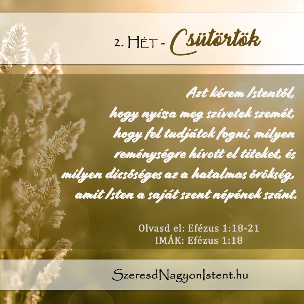 „Azt kérem Istentől, hogy nyissa meg szívetek szemét, hogy fel tudjátok fogni, milyen reménységre hívott el titeket, és milyen dicsőséges az a hatalmas örökség, amit Isten a saját szent népének szánt.” – Efézus 1:18