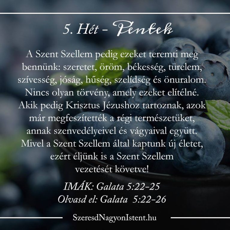 Tudom, vannak olyan napok, amikor úgy érezzük, hogy a Lélek gyümölcse alig látható. Gyengének vagy eredménytelennek érezzük magunkat és azt hisszük, hogy mi sosem fogunk megváltozni vagy növekedni. Ne dőljetek be ennek a hazugságnak! A Galata 5:25 emlékeztet bennünket arra, hogy Krisztussal együtt meg lettünk feszítve! Az óemberünk – a bűnös természetünk – halálba lett adva. Újjá vagyunk teremtve! És bár a bűn még mindig belénk kapaszkodik, többé már nincs felettünk hatalma. Krisztus halála miatt győztesek vagyunk és növekedhetünk a Lélek gyümölcseiben, mert Jézus feltámasztó ereje hatalmasan munkálkodik azokban, akik belé kapaszkodnak.