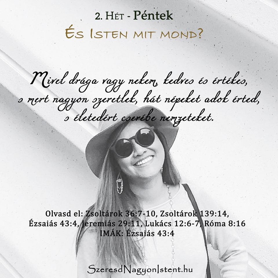 Gyertek, fejezzük be a hetet néhány csodálatos gondolattal, amit Isten mond rólad! Amikor elolvasod a mai Igeverseket, rájössz (ha még nem tetted volna), hogy nagyon értékes vagy Atyád szemében. Drága. Szeret és megbecsül. Csodálatosan alkotott meg. Értékes vagy.