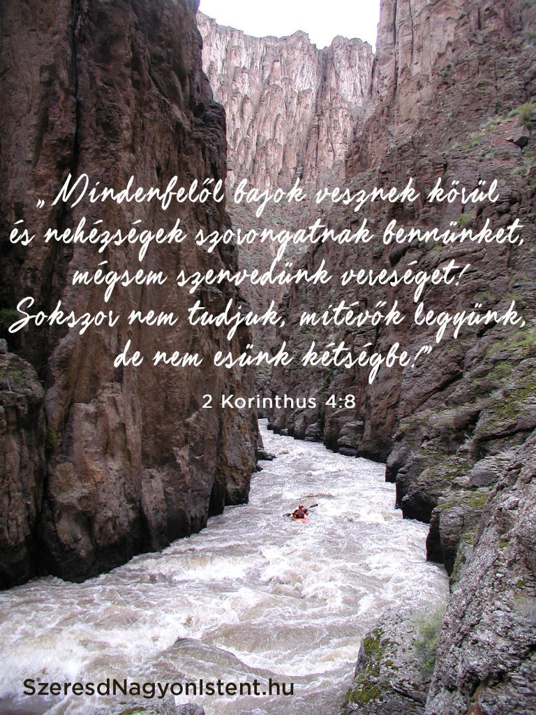 „Mindenfelől bajok vesznek körül és nehézségek szorongatnak bennünket, mégsem szenvedünk vereséget! Sokszor nem tudjuk, mitévők legyünk, de nem esünk kétségbe! Üldöznek, de Isten nem hagy el bennünket. Néha földre terítenek, de nem tudnak egészen elpusztítani.” 2 Korinthus 4:8-9
