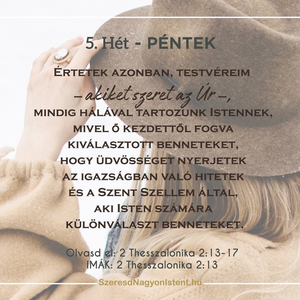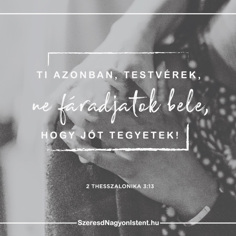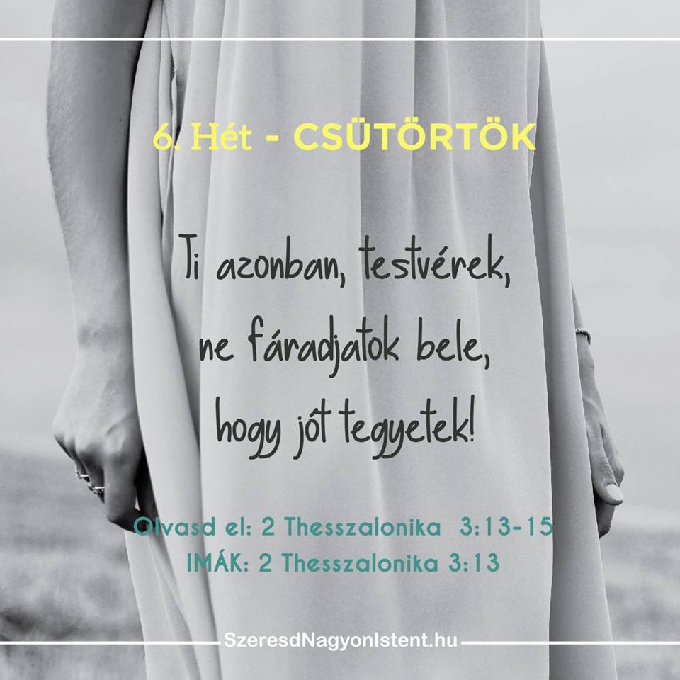 Olvasd el!: 2 Thesszalonika 3:13-15 IMÁK: 2 Thesszalonika 3:13 Pál arra bíztatja a thesszalonikai hívőket, hogy ne fáradjanak el jót cselekedni. Mint testvérek Krisztusban, arra vagyunk hivatottak, hogy egymás előtt elszámoltathatók legyünk. Ahelyett, hogy az ellenkező irányba néznénk, mikor valaki éppen bűnbe esik, szeretettel fel kell hívnunk a figyelmét az igazságra, bíztassuk őket bűnvallásra […]