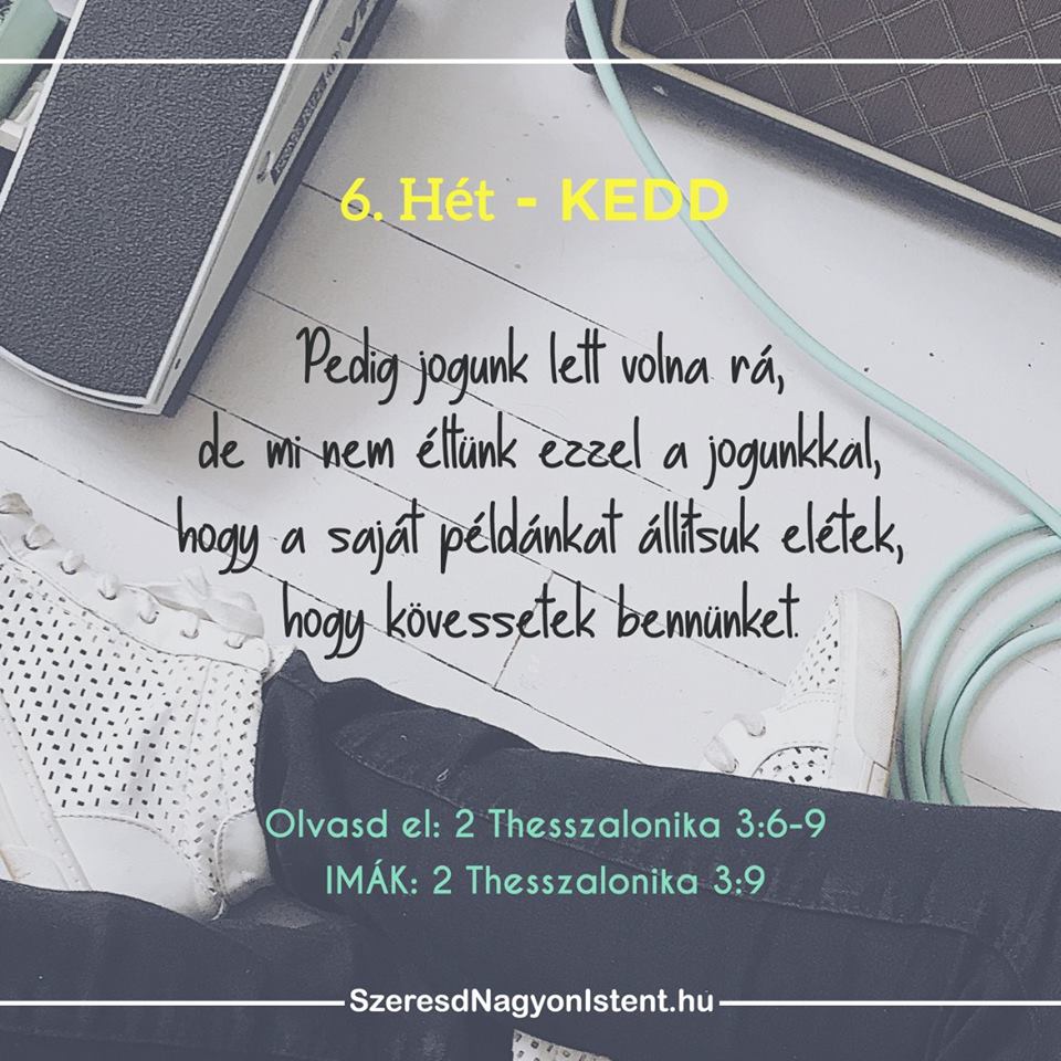 Olvasd el!: 2 Thesszalonika 3:6-9 IMÁK: 2 Thesszalonika 3:9 Az Úr visszajövetelére várva, szorgalmasan munkálkodnunk kell Isten dolgain, és keményen dolgoznunk, hogy biztosítsuk a családunknak a szükségeseket. Néhányan a thesszalonikai hívők közül az Úr közeli visszajövetelére hivatkozva tétlenségbe és letargiába merültek. Pál arra mutat rá, hogy a holnap dicsőségének reménye nem szabad, hogy befolyásolja […]