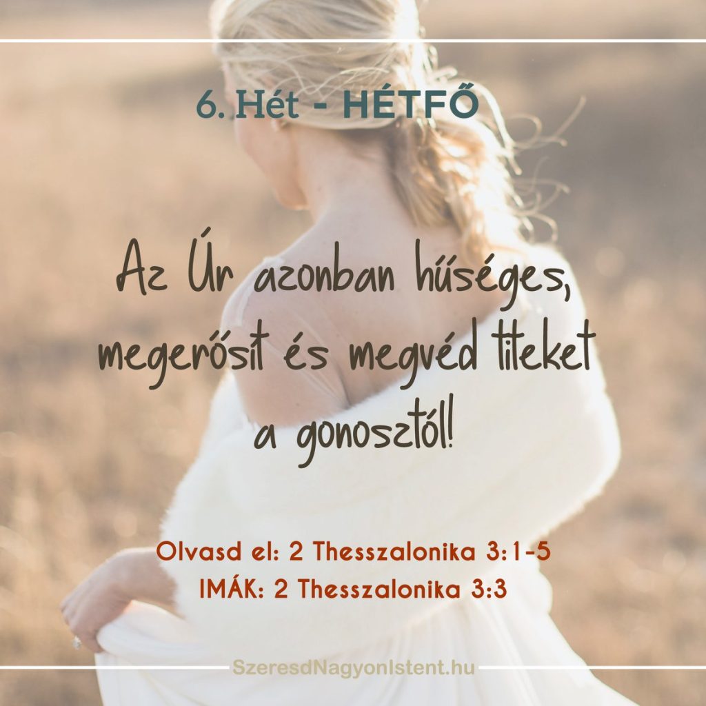 Olvasd el!: 2 Thesszalonika 3:1-5 IMÁK: 2 Thesszalonika 3:3 Pál sokszor csalódott az emberekben a megpróbáltatások idején. Ebben a néhány versben segít a thesszalonikai keresztényeknek megérteni, hogyan harcoljanak a csüggedés ellen, mikor a barátaik elfordulnak a hittől. Először Pál arra biztatja őket, hogy imádkozzanak védelemért és gondviselésért, hogy az evangélium üzenete terjedjen, az ellenség mesterkedései […]