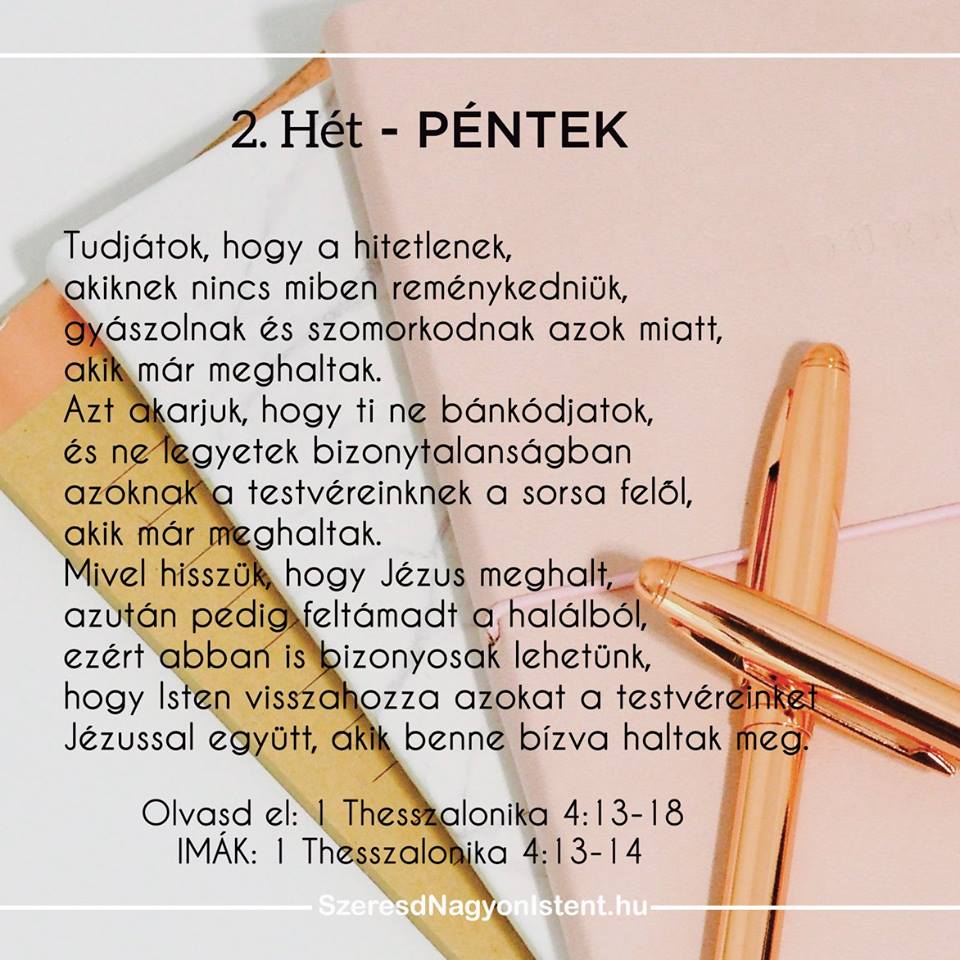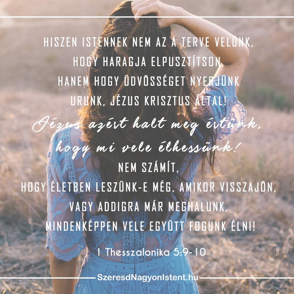 Olvasd el!: 1 Thesszalonika 4:13-18 IMÁK: 1 Thesszalonika 4:13-14 Pál azzal vigasztalja a Thesszalonikában élő hívőket, hogy Krisztus vissza fog jönni gyermekeiért. Azok, akik Krisztusba helyezik hitüket bűneik bocsánatára és még azelőtt meghalnak, hogy Krisztus visszatér, elsőként támadnak fel a trombita hangjára. Végül azok a hívők, akik életben lesznek, elragadtatnak, hogy találkozzanak Krisztussal a levegőben. […]