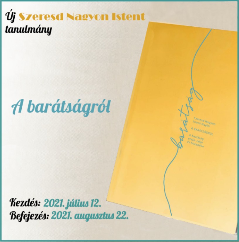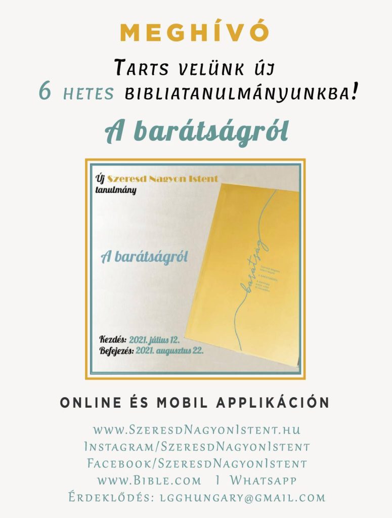 Szeretettel hívunk, hogy tanulmányozz ismét a Szeresd Nagyon Istent online női Bibliatanulmányozó szolgálattal! Új tanulmányunk címe: A barátságról Kezdés: 2021. július 12. (hétfő)Befejezés: 2021. augusztus 22. (vasárnap)Tanulmányi idő: 6 hét „Gondoltál valaha arra, hogy a barátságoddal is bizonyságot tehetsz az evangéliumról? Az, ahogyan a barátainkkal viselkedünk, nagymértékben tanúskodik Isten szeretetéről. Ahogyan a barátainkat szeretjük, hordozzuk […]