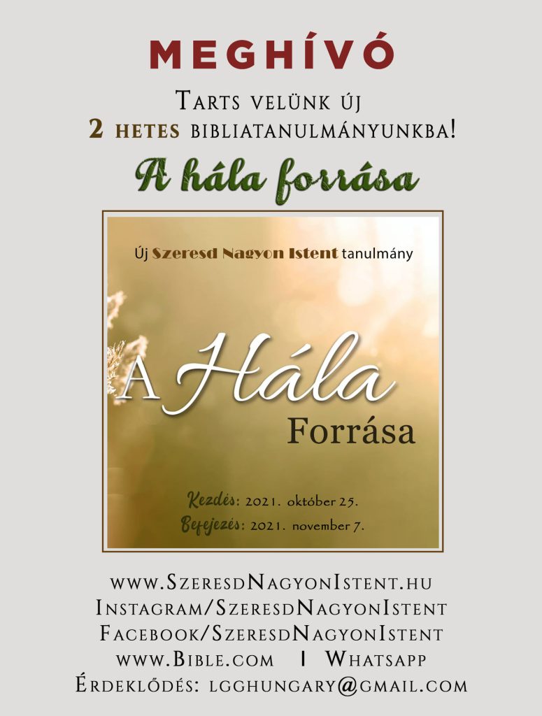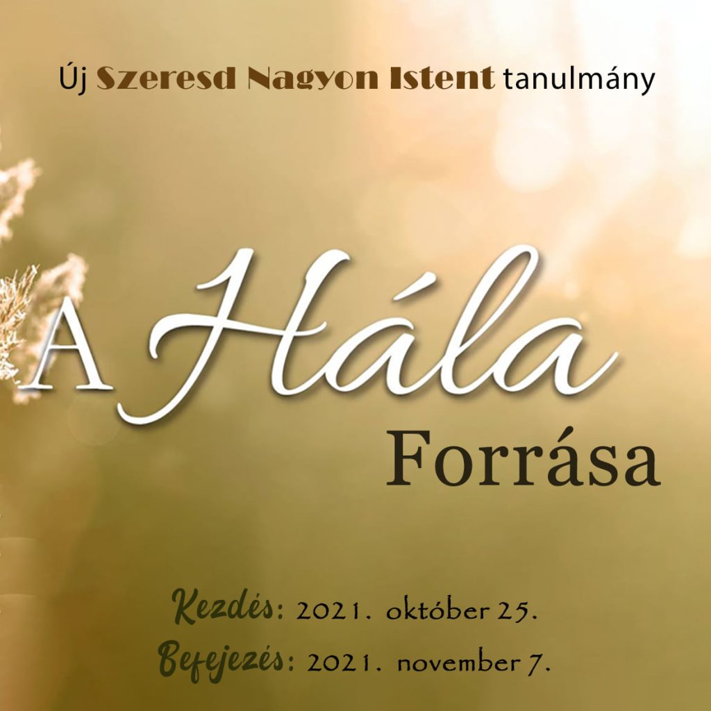 Szeretettel hívunk, hogy tanulmányozz ismét a Szeresd Nagyon Istent online női Bibliatanulmányozó szolgálattal! Új tanulmányunk címe: A hála forrása Kezdés: 2021. október 25. (hétfő)Befejezés: 2021. november 7. (vasárnap)Tanulmányi idő: 2 hét Amikor a hálára gondolunk, általában az ideiglenes dolgokra koncentrálunk: az egészségünkre, családunkra, az asztalunkon lévő ételekre… ezek mind csodálatos dolgok, amikért hálát kell adnunk! […]