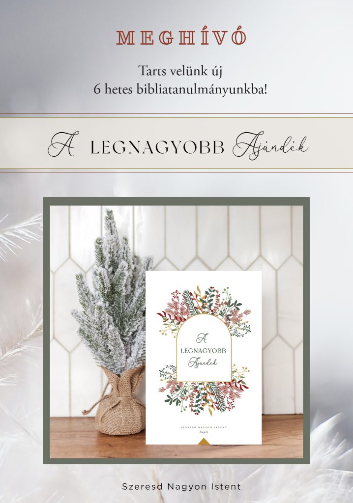 Szeretettel hívunk és várunk a Szeresd Nagyon Istent online, női bibliatanulmányozó szolgálat következő tanulmányába! Az új tanulmány címe: A legnagyobb ajándék A kezdés időpontja: 2023. november 6. Ismersz olyan keresztény hölgyeket, akik vágynak arra, hogy mélyre ássanak Isten Igéjében és szívesen lennének részesei egy online keresztény közösségnek? Ha igen, oszd meg velük az alábbi képet […]