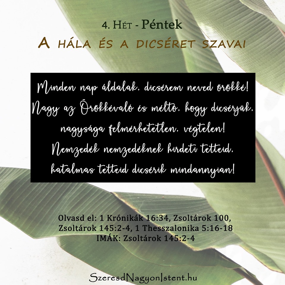 A hála és a dicséret szavai Olvasd el: 1 Krónikák 16:34, Zsoltárok 100, Zsoltárok 145:2-4, 1 Thesszalonika 5:16-18 IMÁK: Zsoltárok 145:2-4 Ez az utolsó napja A szavak hatalma tanulmányunknak. Milyen volt? Remélem értékes dolgokat tanultál szavaid használatáról! A mai Igeversek a háláról és a dicséretről beszélnek. Isten folyamatosan cselekszik az életünkben. Némelyik cselekedete nagy és […]