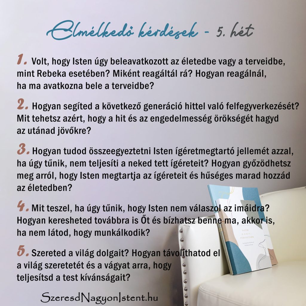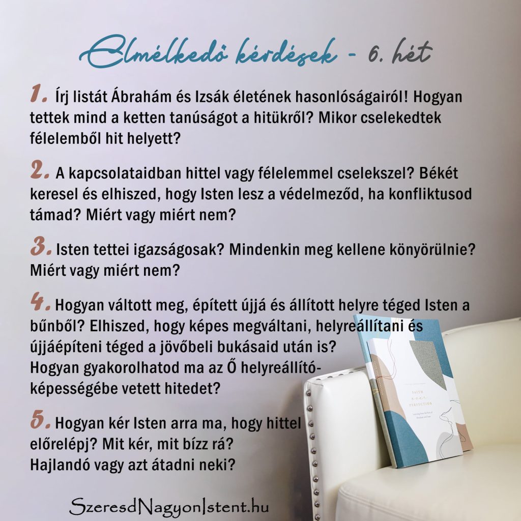 5. heti kihívás: Miért ilyen fontos Isten számára a hit? Mit jelent, hogy bizonyosak lehetünk a reménységünkben, és megbizonyosodhatunk arról, amit nem látunk? Ezen a héten gondolkodj el Ábrahám, Sára, Izsák és Rebeka hitén! Mit tanulhatsz az ő hitükből?