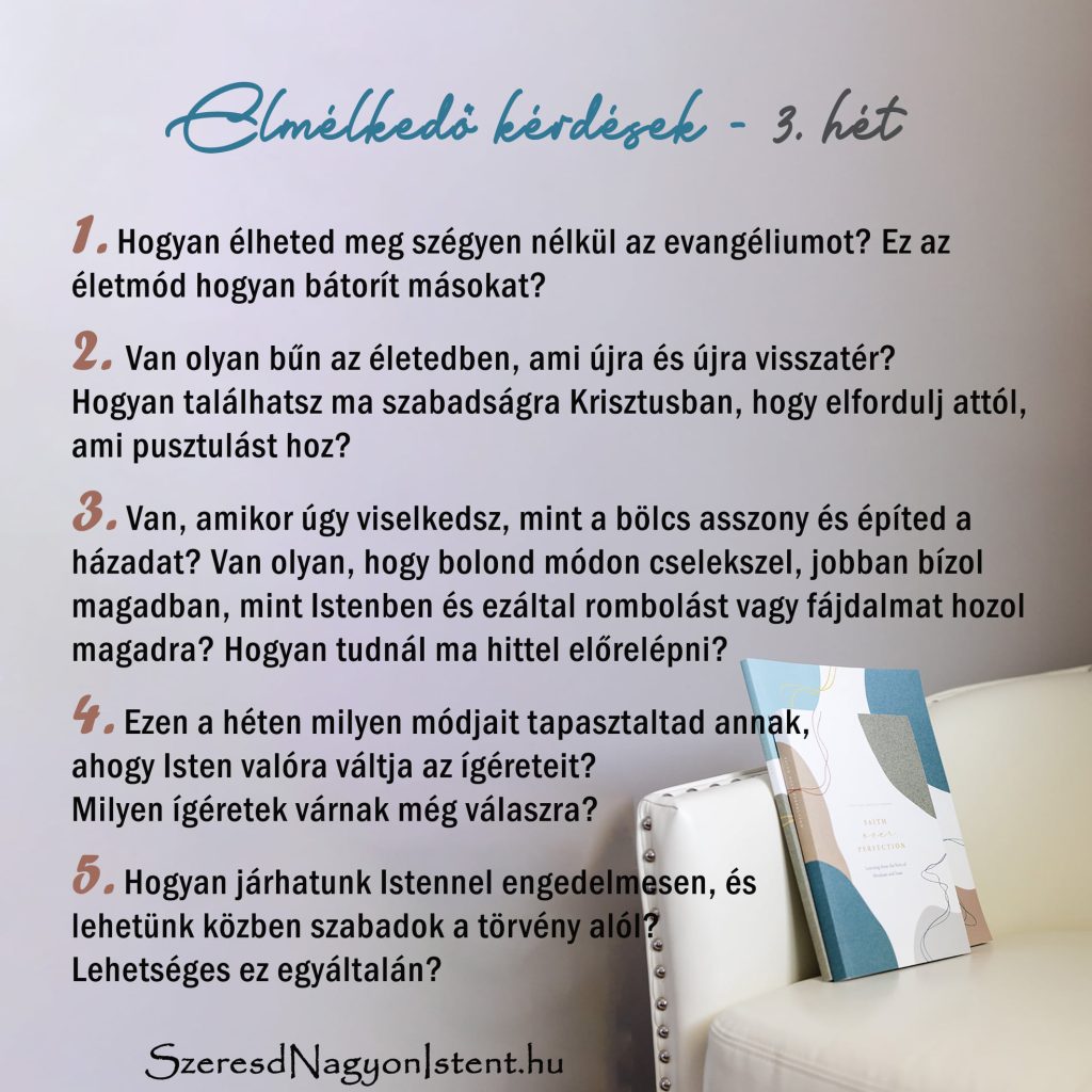 3. heti kihívás: Mit jelent hit által élni? Hittel éled a mindennapjaidat? Ezen a héten kérd Istent, hogy mutasson rá életed azon területeire, amelyeket még nem bíztál rá teljesen! Hogyan tudod átadni ezeket neki?