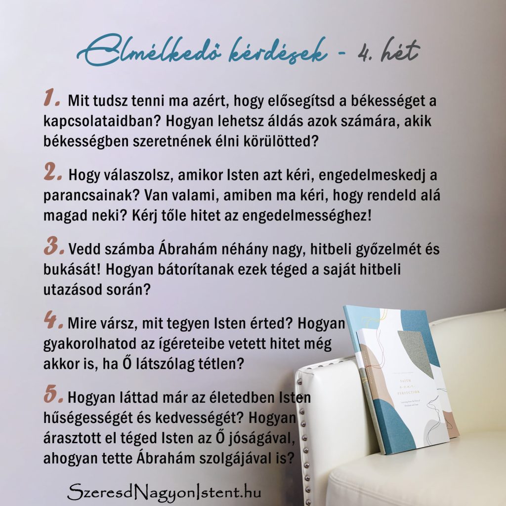 4. heti kihívás: Ezen a héten, miközben Ábrahám történetét olvasod, gondolkodj el hitbeli utazásod győzelmein és bukásain! Mikor, milyen helyzetben tudtál erős hittel és engedelmességgel megállni? Volt olyan idő, amikor küszködtél a hiteddel? Kérd Istent, hogy segítsen neked emlékezni, és felidézni a hitéletedet, és adjon neked bölcsességet arra, hogy meglásd, mit szeretne, merre menj tovább!