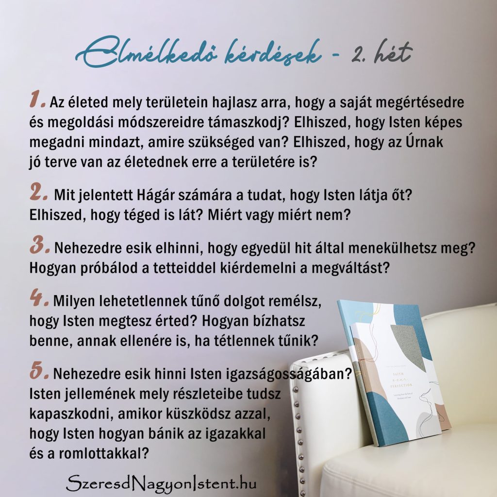 2. heti kihívás: Ezen a héten figyeld meg, hogy az igeszakaszok Isten jellemének milyen részleteit fedik fel! Vannak köztük újak, esetleg szokatlanok, amelyeket szívesebben megértenél mélyebben? Kérd Istent, hogy jobban meg tudd érteni az Ő jellemét! Ezen a héten szánj extra időt arra, hogy tanulmányozod Isten egy olyan személyiségjegyét, ami számodra új, vagy szokatlan volt!