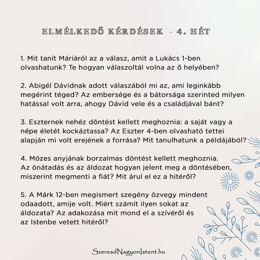 4. heti kihívás: Az önátadás nehéz, de gyönyörű folyamat. Ezt látjuk azon nők életéből, akikkel e héten találkozunk. A te életedben ki erre a jó példa? Bátorítsd őt ezen a héten a szavaiddal és tudasd vele, hogy hűségességének milyen hatása van az életedre!
