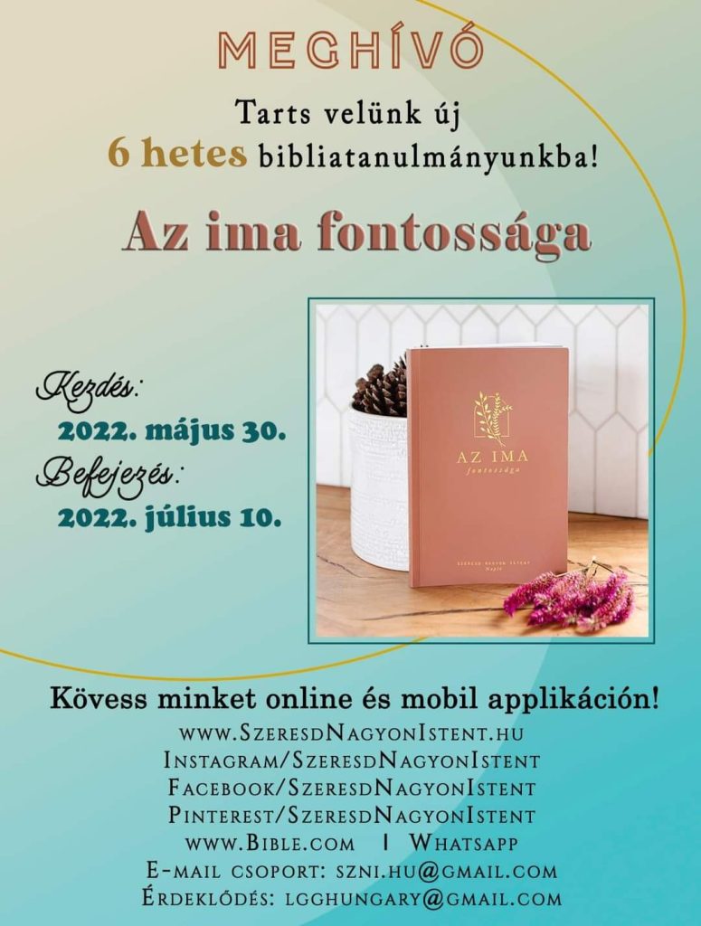 Szeretettel hívunk és várunk a Szeresd Nagyon Istent online női bibliatanulmányozó szolgálat következő tanulmányába! Az új tanulmány címe: Az ima fontossága A kezdés időpontja: 2022. május 30. Ismersz olyan keresztény hölgyeket, akik vágynak arra, hogy mélyre ássanak Isten Igéjében és szívesen lennének részesei egy online keresztény közösségnek? Ha igen, oszd meg velük az alábbi képet […]