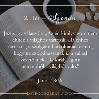 Olvasd el: János 18:33-37 IMÁK: János 18:36 Jézus a mi királyunk, azonban kora arrogáns vallási vezetői nem értették meg az Ő királyságának menetrendjét. Azt várták tőle, hogy nyers erőt alkalmazva szabadítsa meg őket a rómaiak elnyomásától. De csalódniuk kellett, mert Krisztus Isten hatalmának engedelmeskedve jött a Földre azért, hogy a megmentse a bűnösöket. Az Ő […]
