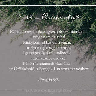 Olvasd el: Ézsaiás 9:6-7 IMÁK: Ézsaiás 9:7 Ézsaiás megmagyarázza, hogy miért örökkévaló az Úr királysága. Ő végtelen békét teremt a szívünkben, és gondoskodik róla, hogy a jó egy napon győzzön a gonosz felett. Az Ő dicsőségének ragyogása még ebben a bűn által elsötétített világban is fénylik, és reményt ébreszt a szívünkben. Így várjuk a napot, […]