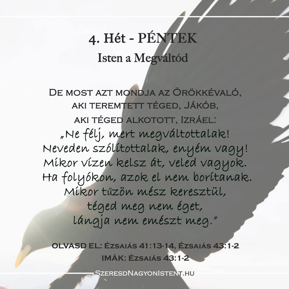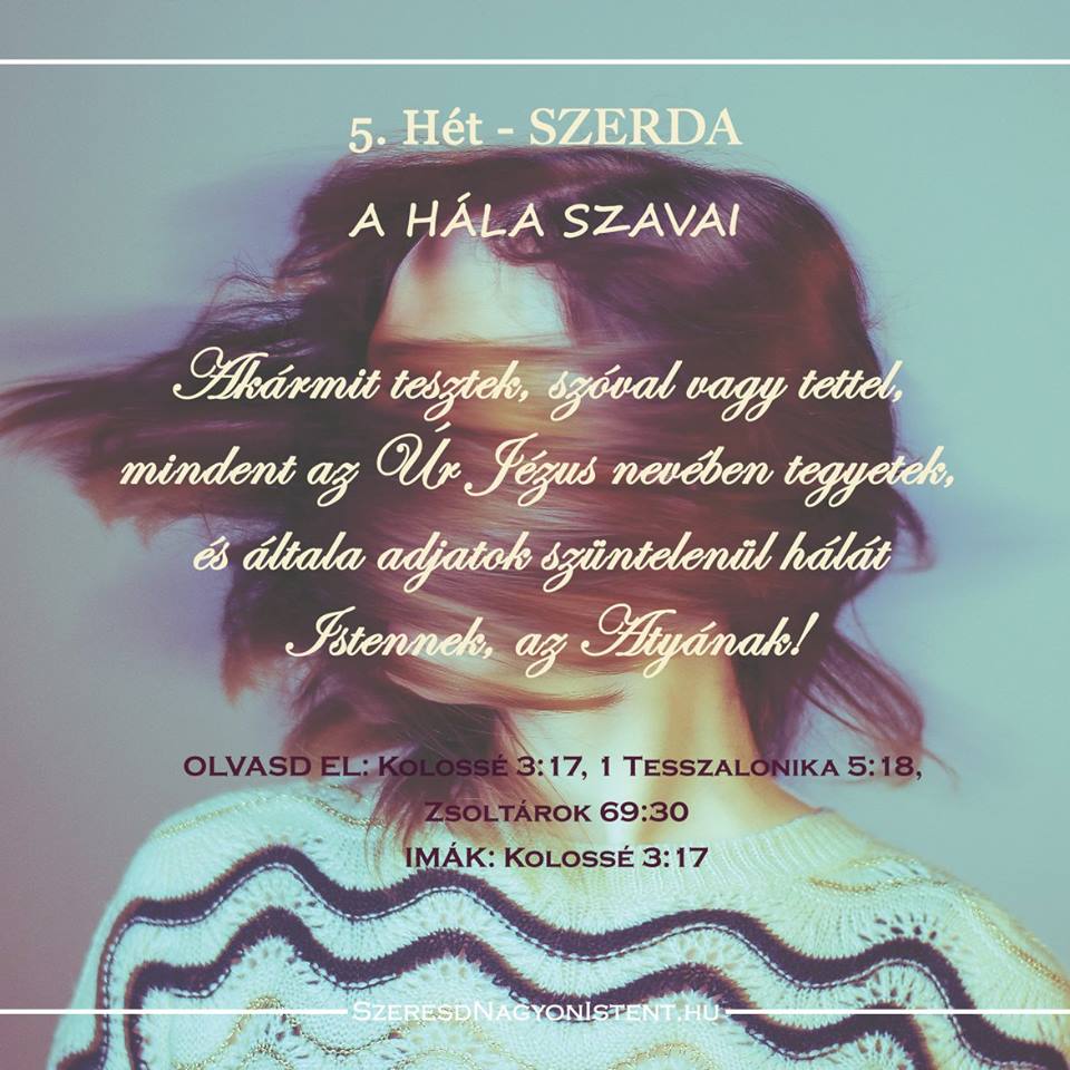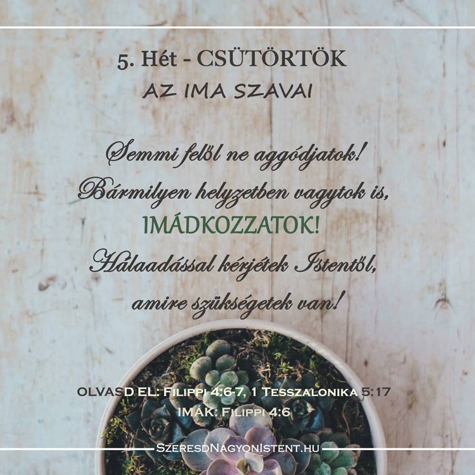 5. heti kihívás: Ezen a héten aggodalmainkat imádságra, áldásainkat hálaadásra váltjuk! Amint az aggodalmak belépnek az elménkbe, szándékosan foglaljuk őket imába. Ne a problémára, hanem a Problémák Megoldójára összpontosítsunk! Keresd szándékosan a lehetőségeket, mikor hálát adhatsz Istennek az életedben tapasztalt áldásokért. Naponta legalább egy áldást jegyezz fel a naplódba.