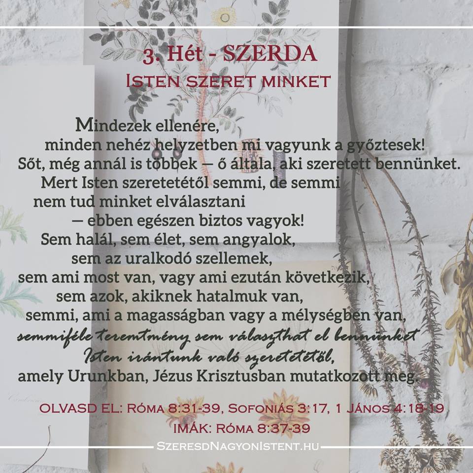 3. heti kihívás: Ezen a héten – amint azon munkálkodunk, hogy egyre jobban Istenre bízzuk az életünket és meglássuk mennyire szeret bennünket, – keressük tudatosan az okokat, amiért dicsőíthetjük Őt, és ismételten mondjunk köszönetet az Ő állandó gondoskodásáért.