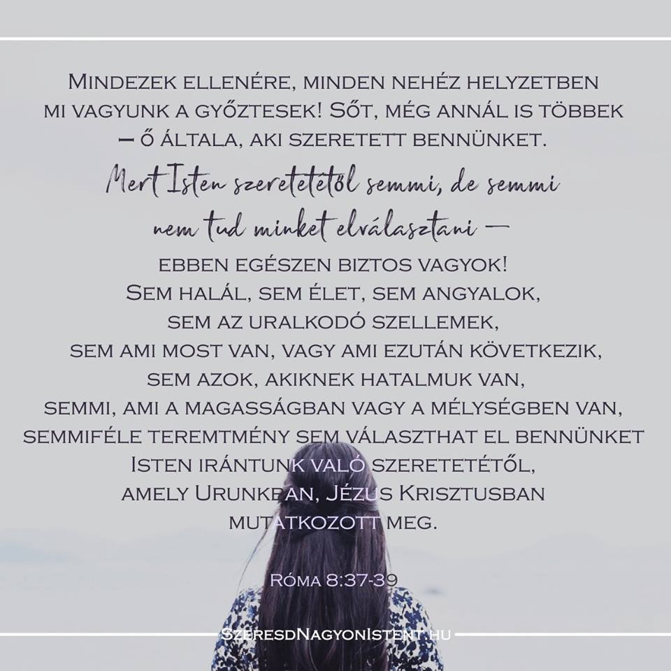 „Mi választhat el bennünket Krisztus szeretetétől? Elnyomás, szenvedés, nyomor, nehézségek, üldözés, éhínség, ruhátlanság, életveszély, vagy akár ha meg is ölnek bennünket? Nem, egyik sem! Mindezek ellenére, minden nehéz helyzetben mi vagyunk a győztesek! Sőt, még annál is többek — ő általa, aki szeretett bennünket. Mert Isten szeretetétől semmi, de semmi nem tud minket elválasztani — […]