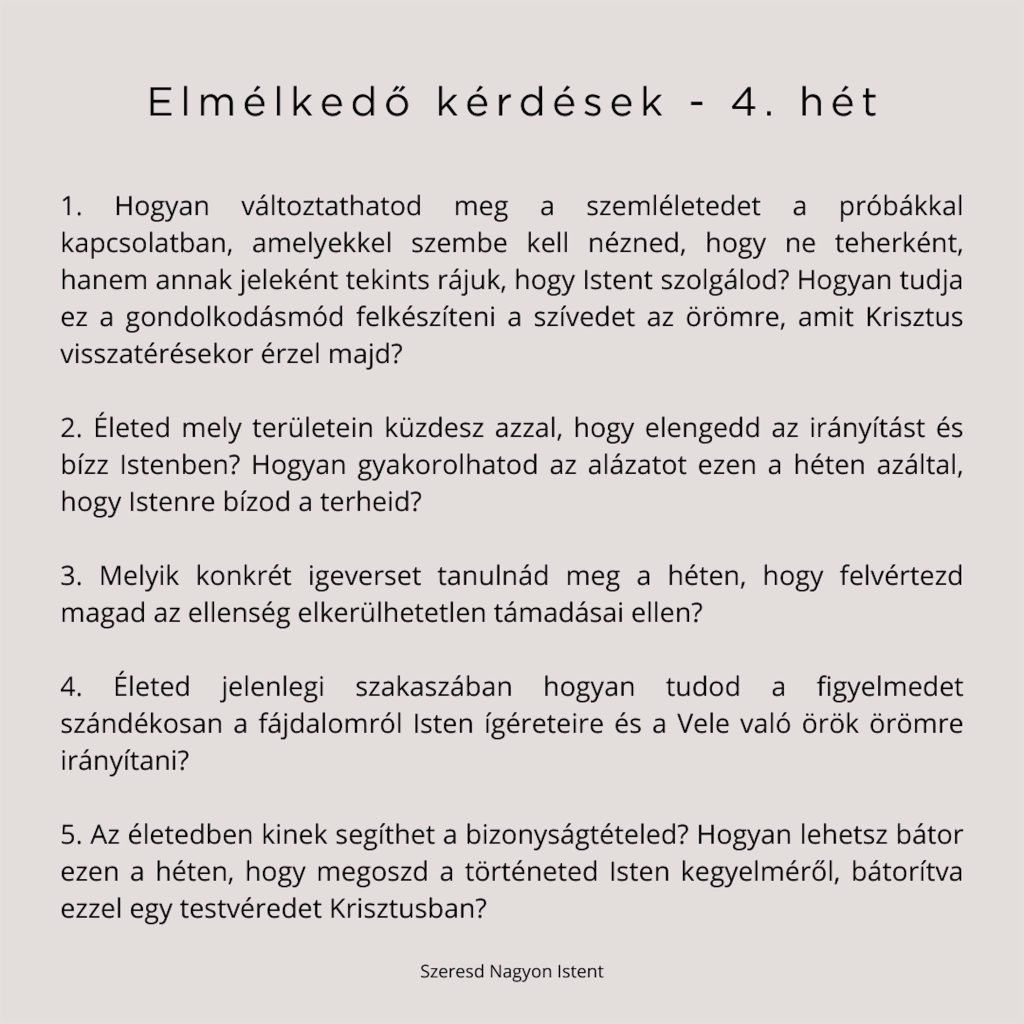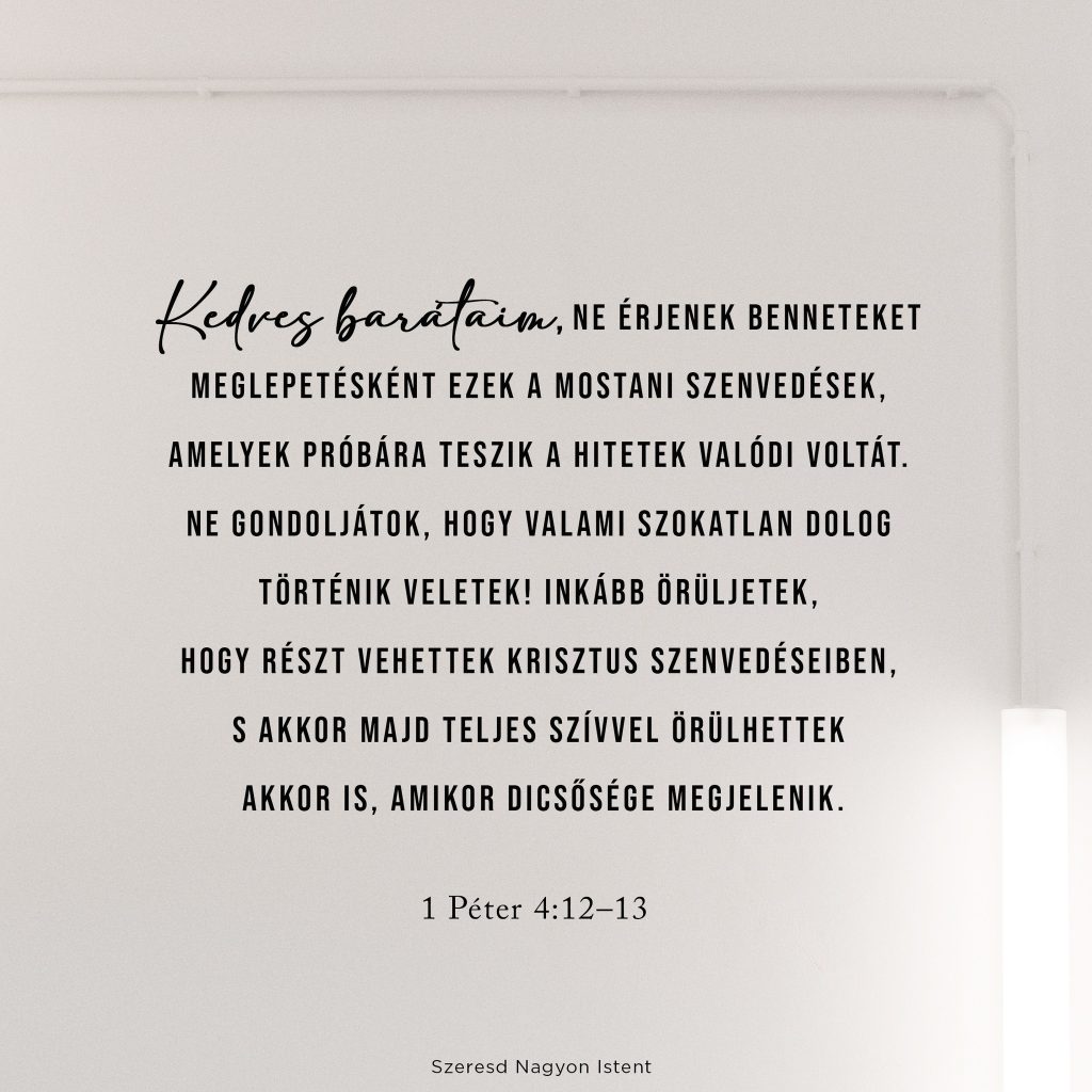 4. heti kihívás: Tanulj meg egy igeverset Péter első leveléből, amely a leginkább hozzád szólt. Miközben memorizálod a választott verset, oszd meg valakivel, aki közel áll hozzád, és mondd el neki, miért fontos számodra az adott igevers. Jegyezd le egy papírra, és tartsd magadnál a kocsiban vagy a házadban. Olvasd el naponta többször!