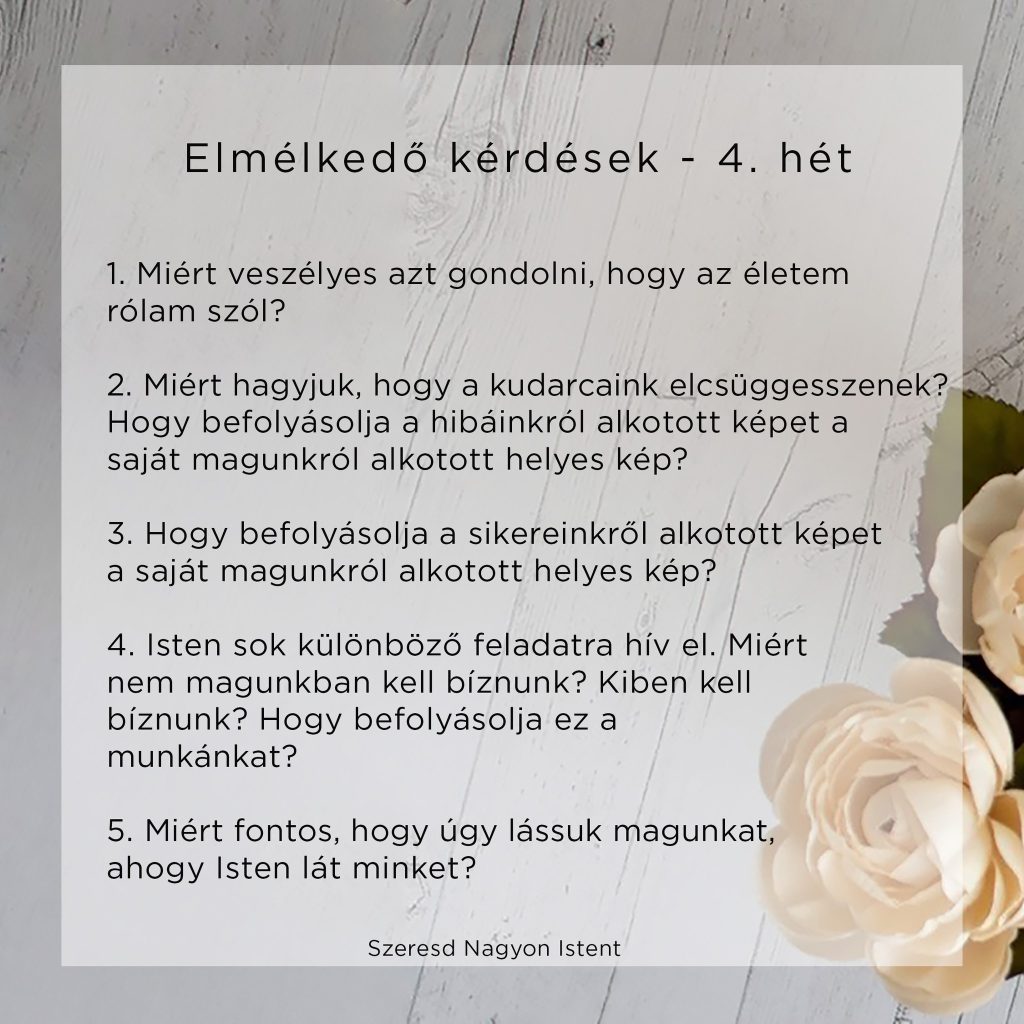 4. heti kihívás: Ezen a héten keresd a lehetőségeket, hogy saját magadról valamilyen szolgálatra tereld a figyelmedet. Megváltoztatja az életedhez való hozzáállásodat? Jegyezd fel ezt a naplódba és oszd meg a csoporttársaiddal, barátaiddal.