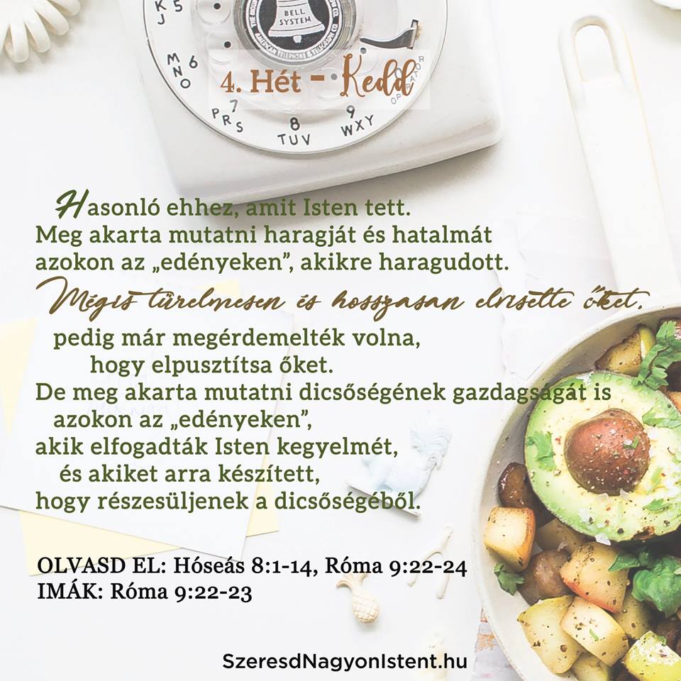 Olvasd el: Hóseás 8:1-14, Róma 9:22-24 IMÁK: Róma 9:22-23 „Királyokat emeltek maguk fölé, de nem általam, vezetőket választottak, de nélkülem. Ezüstjükből, aranyukból bálványokat emeltek, amelyekre pusztulás vár.” (Hóseás 8:4) Izráel népe szakértői voltak annak, hogyan kell Istentől független életet élni. Döntést hozni anélkül, hogy Isten vezetését keresnénk, nemcsak bűnös dolog, hanem bolondság is! Micsoda hiba! […]