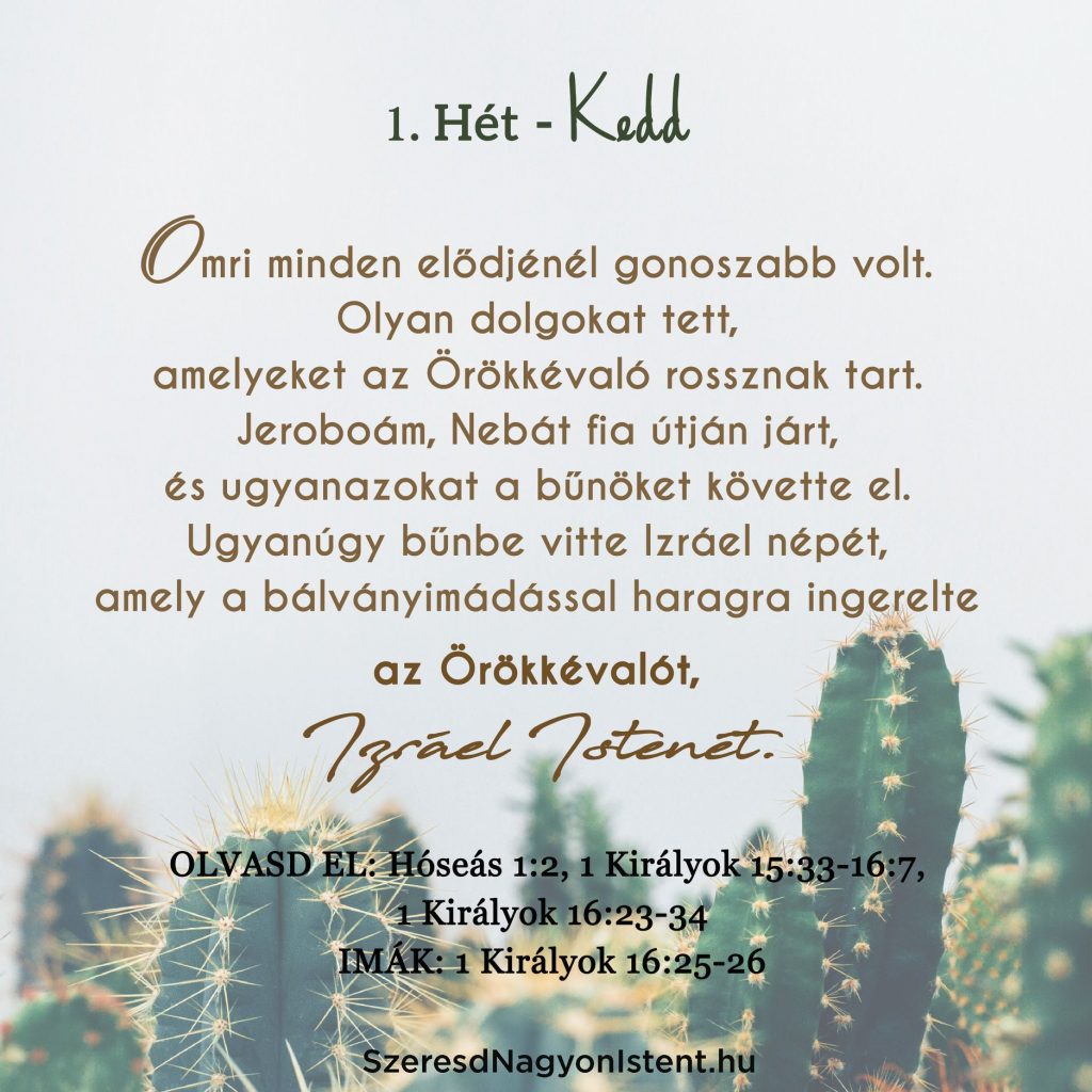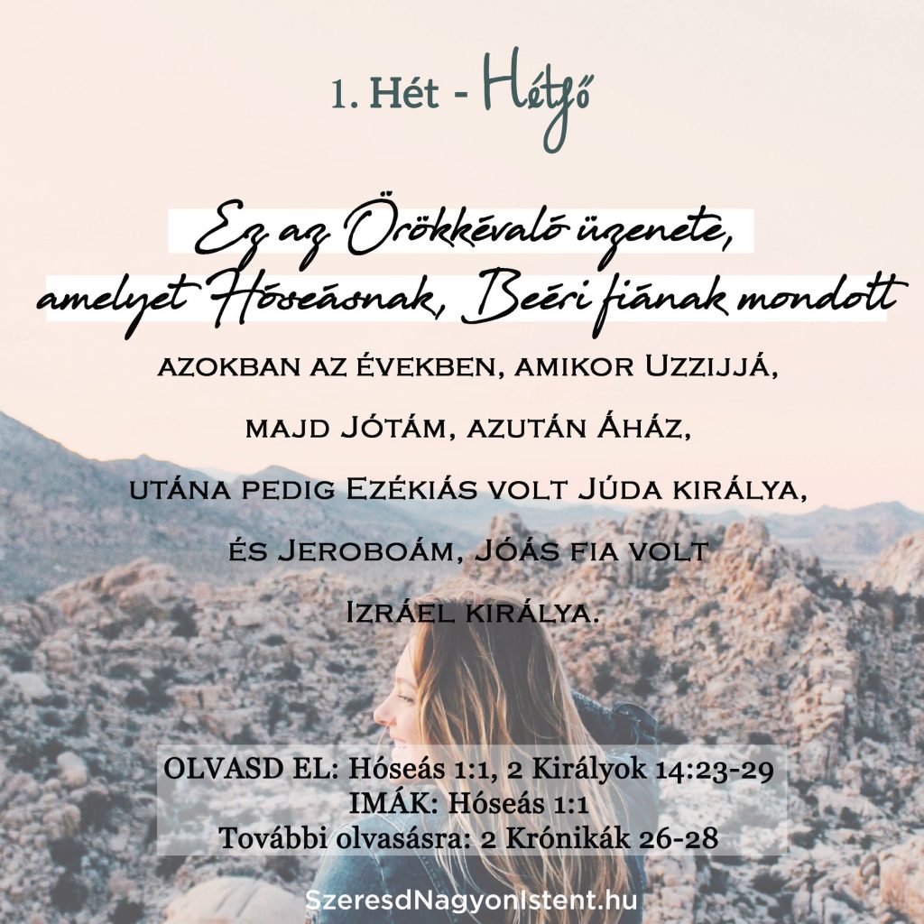 Olvasd el: Hóseás 1:1, 2 Királyok 14:23-29 IMÁK: Hóseás 1:1 További olvasmány: 2 Krónikák 26-28 Mai Igéink Hóseást és Jeroboámot mutatják be. Hóseás próféta volt. A neve „megváltást” jelent. Ugyanabból a héber gyökérből ered (hoshea) mint a Józsué és Jézus név. Hóseás könyve végig arról szól, hogy a megváltás az Istenhez fordulás és a bűneinktől […]