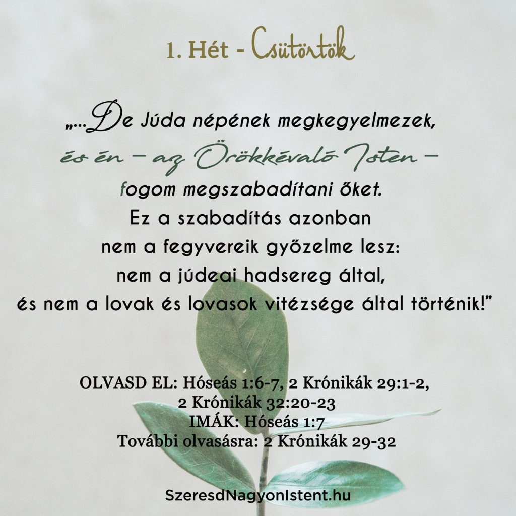Olvasd el: Hóseás 1:6-7, 2 Krónikák 29:1-2, 2 Krónikák 32:20-23 IMÁK: Hóseás 1:7 További olvasmány: 2 Krónikák 29-32 Hóseás és Gómer második gyermeke egy lány volt, aki a Lo-Ruhamah (Hós 1:6–7) nevet kapta, ami annyit jelent: „nem szánt” vagy „nem szeretett”. Isten nagyon szerette a népét, és ezt számtalan alkalommal be is bizonyította, de most […]