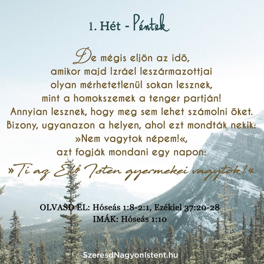Olvasd el: Hóseás 1:8-2:1, Ezékiel 37:20-28 IMÁK: Hóseás 1:10 Az 1 Mózes 22:17 versében Isten emlékezteti Ábrahámot az ígéretére, mely szerint meg fogja áldani és sokasítani a leszármazottjait „mint égen a csillagokat, és mint tenger partján a homokot”. Isten nem olyan, mint mi. Ha tesz egy ígéretet, biztosak lehetünk benne, hogy meg is tartja, míg […]