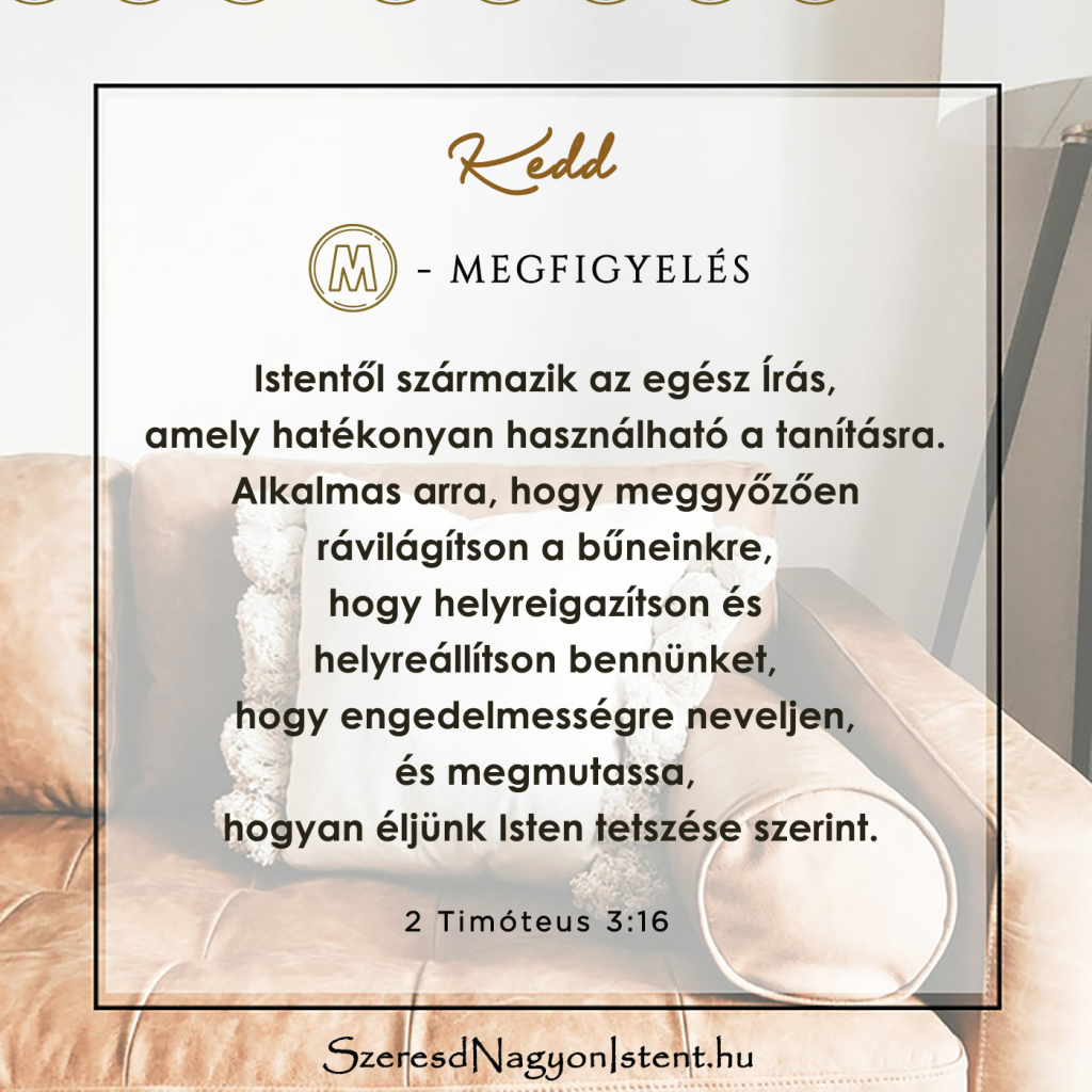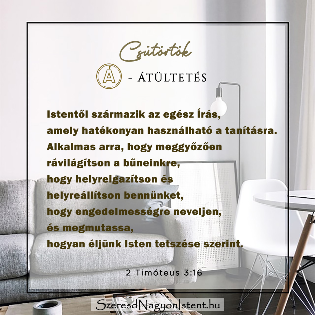 Á – Átültetés Az átültetés a bibliatanulmányozás fontos része. Arról szól, hogyan tesszük át a gyakorlatba mindazt, amit megtanultunk. Először is biztosnak kell lennünk abban, hogy jól megértettük azt, amit az adott szakasz tanít, hogy az alkalmazásunk helyes és Istennek tetsző legyen. Az átültetés célja az, hogy megtaláljuk azokat az alapelveket, amelyek a jelenlegi helyzetünkre […]