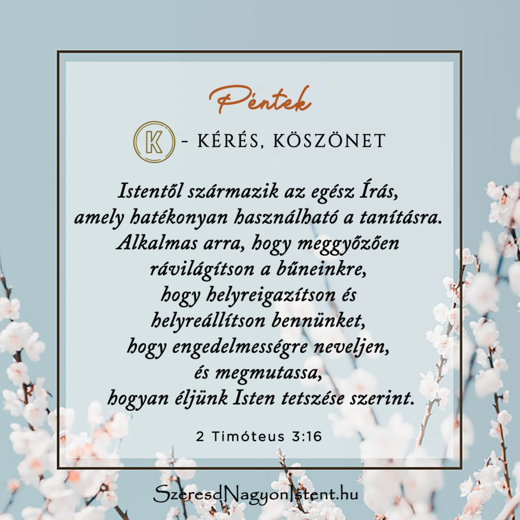 K – Kérés, köszönet Az ima az IMÁK-módszer utolsó része. Itt mondjuk el imádságban Istennek mindazt, amit a megfigyelésből megtanultunk, és amiről elhatároztuk, hogy alkalmazzuk az életünkre vonatkozóan. Amikor egy szakasz alapján imádkozunk, először válaszoljuk meg a következő kérdéseket: Mit mond ez a szakasz Istenről? Annak alapján, amit ebből a szakaszból tanultam, van olyan dolog […]
