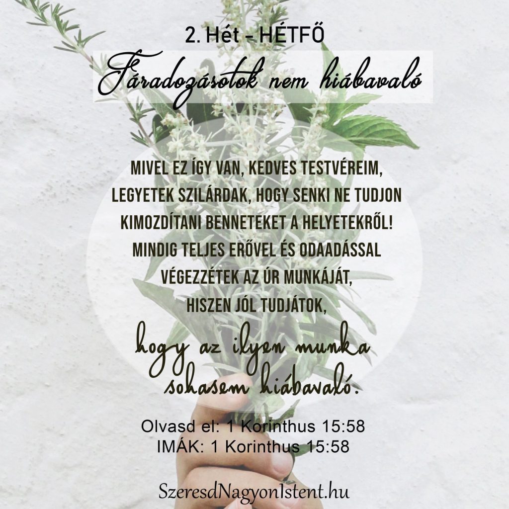 Fáradozásotok nem hiábavaló Olvasd el: 1 Korinthus 15:58IMÁK: 1 Korinthus 15:58 Pál arra biztatja az első korinthusi gyülekezet tagjait, hogy szilárdan álljanak a hitben, mert valami nagyszerűbb dolog fog következni. Krisztus vissza fog jönni a gyermekeiért, és a bűn elleni harcnak és a halálnak egyszer s mindenkorra vége lesz. A Menny ígérete segít a hívőknek, […]