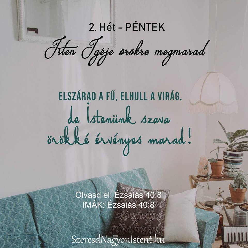 Isten Igéje örökre megmarad Olvasd el: Ézsaiás 40:8IMÁK: Ézsaiás 40:8 Legértékesebb tulajdonunk Isten Igéje. Nincs az az ellenség, aki behatolhatna a szívünkbe, és elrabolhatná onnan Isten bennünk élő Igéjét. Lehet, hogy oda az egészségünk, az életbiztosításunk és a megtakarításaink, de Isten Igéjének romolhatatlan magja mindig gyümölcsöt fog hozni az életünkben. Mennyire egészséges szívünk kertje? Öntözzük […]