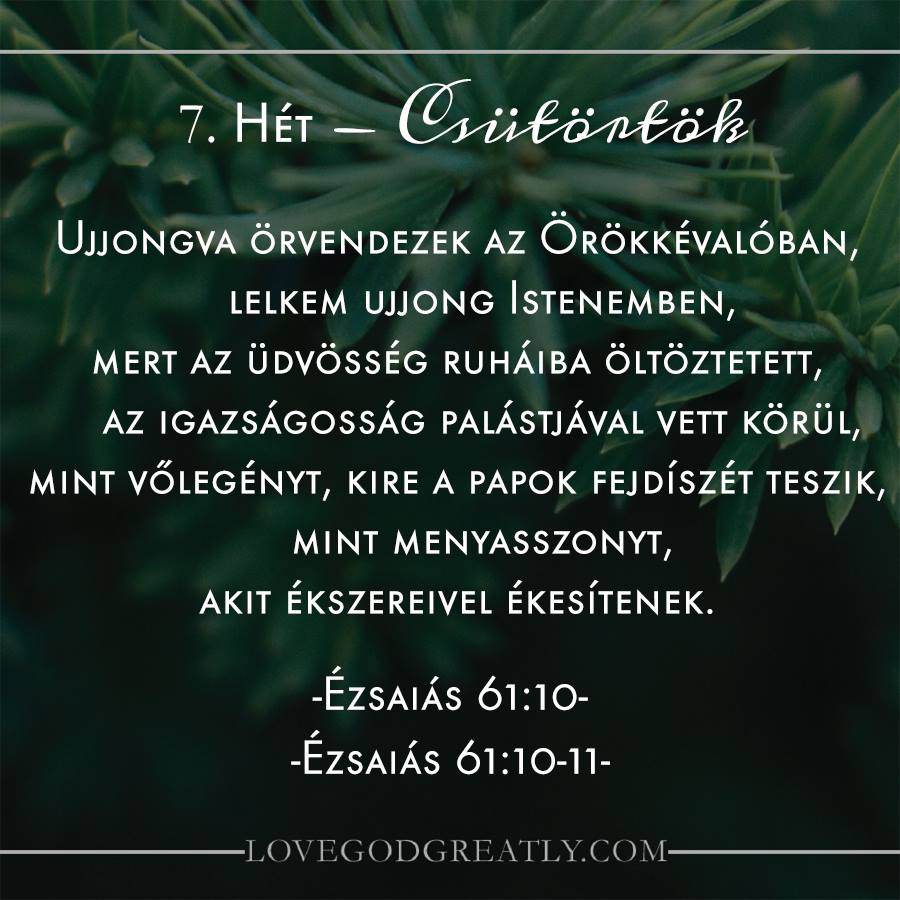 Olvasd el: Ésaiás 61:10-11 IMÁK – Ésaiás 61:10 Keresztyénekként megnyugodhatunk abban az ígéretben, hogy amikor Isten az Ő elesett és tökéletlen népére tekint, Krisztus igazságosságát és tökéletességét látja. Bátran megállhatunk Isten előtt szégyen, félelem, bűntudat és kárhoztatás nélkül. Jézus Krisztus a mi bűneinket és szégyenünket felváltotta az Ő igazságosságával. Örvendezhetünk és dícsérhetjük Istent azért a […]