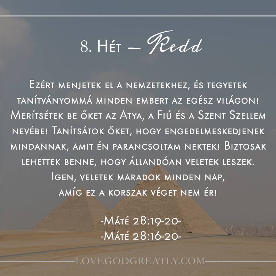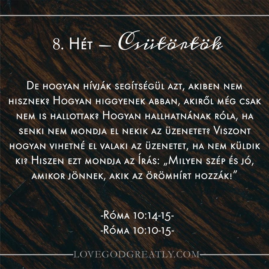 Olvasd el: Máté 28: 16-20 IMÁK: Máté 28: 19-20 A keresztények arra hivatottak, hogy tanítványokká tegyenek embereket. Tanítványokká tehetünk embereket úgy is, hogy segítjük a kezdő hívők kapcsolatát növekedni, erősödni Istennel. Ez a feladat azt igényli, hogy mély és tartalmas kapcsolatot alakítsunk ki azokkal, akik éhezik az Urat, valamint időt és energiát kell áldoznunk érte. […]