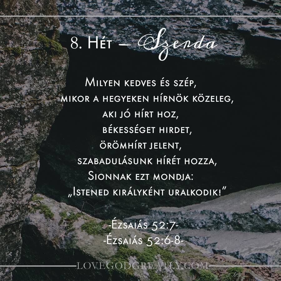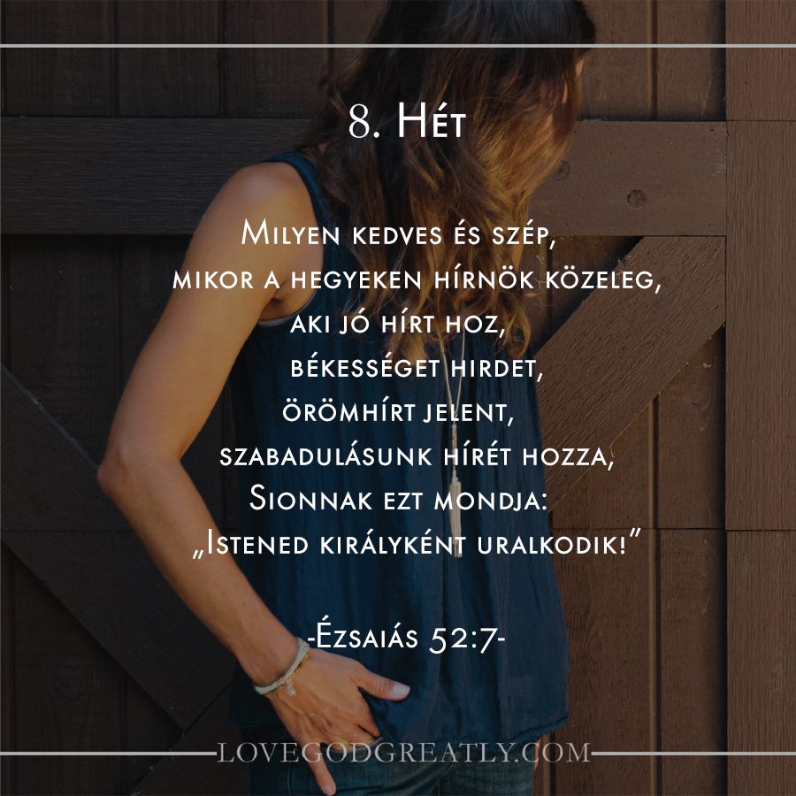 Kedves Lányok! Tanulmányunk utolsó hetében egy gyönyörű ige megtanulására bátorítunk titeket. Egy jóhírt, örömöt, békességet, szabadulást hirdető hirnök közeledése mindig várakozással teli. Ma ez az igevers egy képként jelent meg előttem. Egy nehéz helyzetben ha már feltűnik előttünk a megoldás, már megkönnyebbülést érzünk. Elképzeltem, hogy a jóhírt szállító hirnök egy hegyről jön lefele, de alakja […]