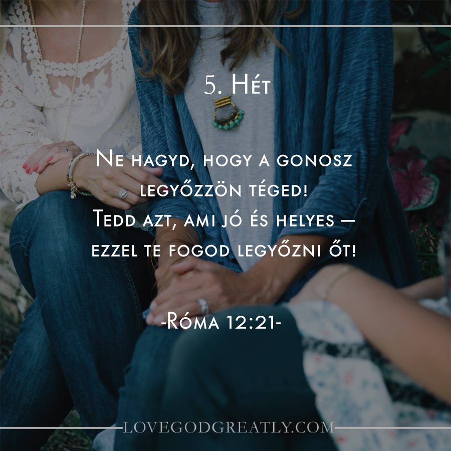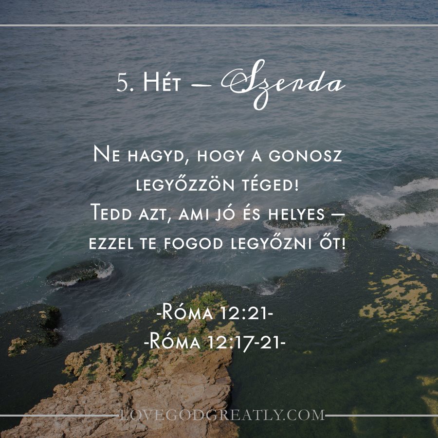 Olvasd el!: Róma 12:17-21 IMÁK: Róma 12:21 A keresztényeket arra hívta el Isten, hogy elől járjanak minden dologban ami jó, és helyes az Ő szemében. Úgy különböztetjük meg magunkat, ahogyan másokkal bánunk, és ahogyan szeretjük őket: ez különösen igaz az ellenségeinkre. Akármilyen nehéz is így tenni, bíznunk kell benne, hogy a mi igazságos Istenünk […]