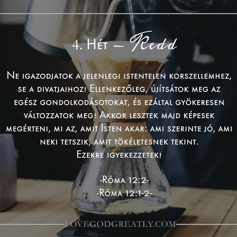 Olvasd el: Róma 12: 1-2 IMÁK: Róma 12:2 Mert a hívő ember egy új teremtménnyé alakul át az üdvözülése napján: motivált, elkötelezett és elhivatott a változásra. A keresztény ember élete már nem a sajátja többé, mert életét Jézus váltotta ki drága áldozatával. A keresztényeknek át kell adniuk önmagukat és mindenüket, amijük van Istennek. Mit teszel […]