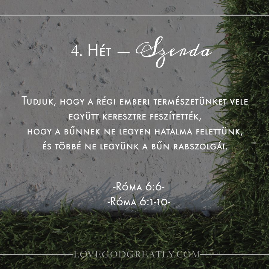 Olvasd el!: 6:1-10 IMÁK: Róma 6:6-7 A bűn nem tűnik el egyetlen keresztény életéből sem a megváltása napján, azonban ő maga eltávolodik a bűntől. A bűnnek többé nincs hatalma arra, hogy legyőzze a keresztényt, vagy, hogy fogva tartsa. Ez nem jelenti azt, hogy a keresztények nem vétkeznek többé, de a bűn hatalmának vége. A keresztényben […]